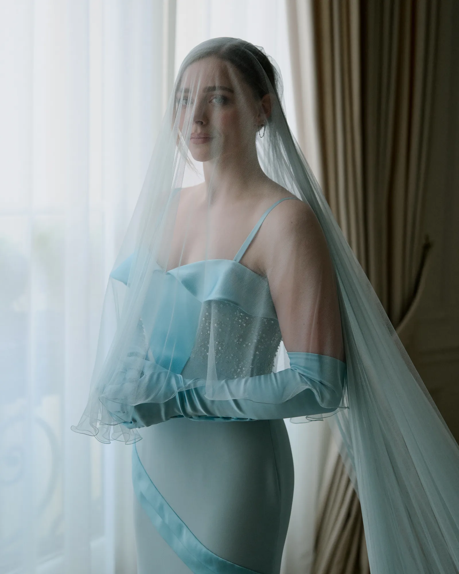 Although official wedding photographs are still under wraps, the newlyweds previewed their bridal fashion in an interview with the magazine. Moretz was styled in a pale blue gown with coordinating gloves by Nicolas Ghesquière for Louis Vuitton, who also created Harrison’s look. For the afterparty, Moretz changed into another custom Louis Vuitton design by Ghesquière — a chic white jacket-and-trouser set, topped off with a cowboy hat.